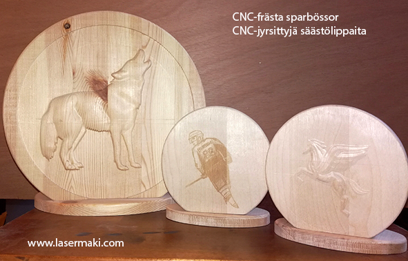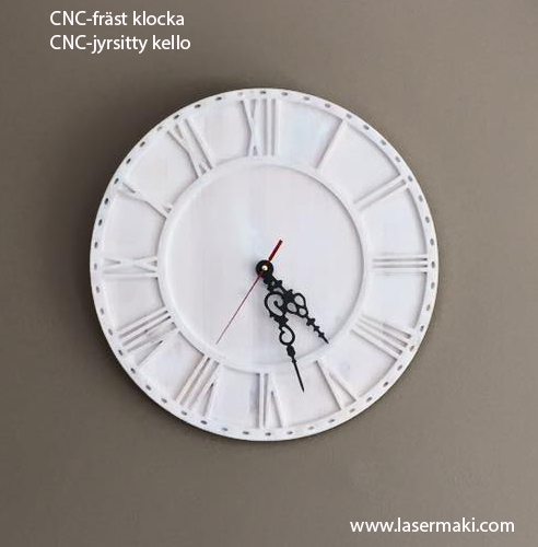 CNC-fräsning kan också kombineras med lasergravyr. Vi kan t.ex fräsa ut en klocka i trä med CNC-fräsen och sen gravera valfri text på klockan med lasergraveringsteknik.